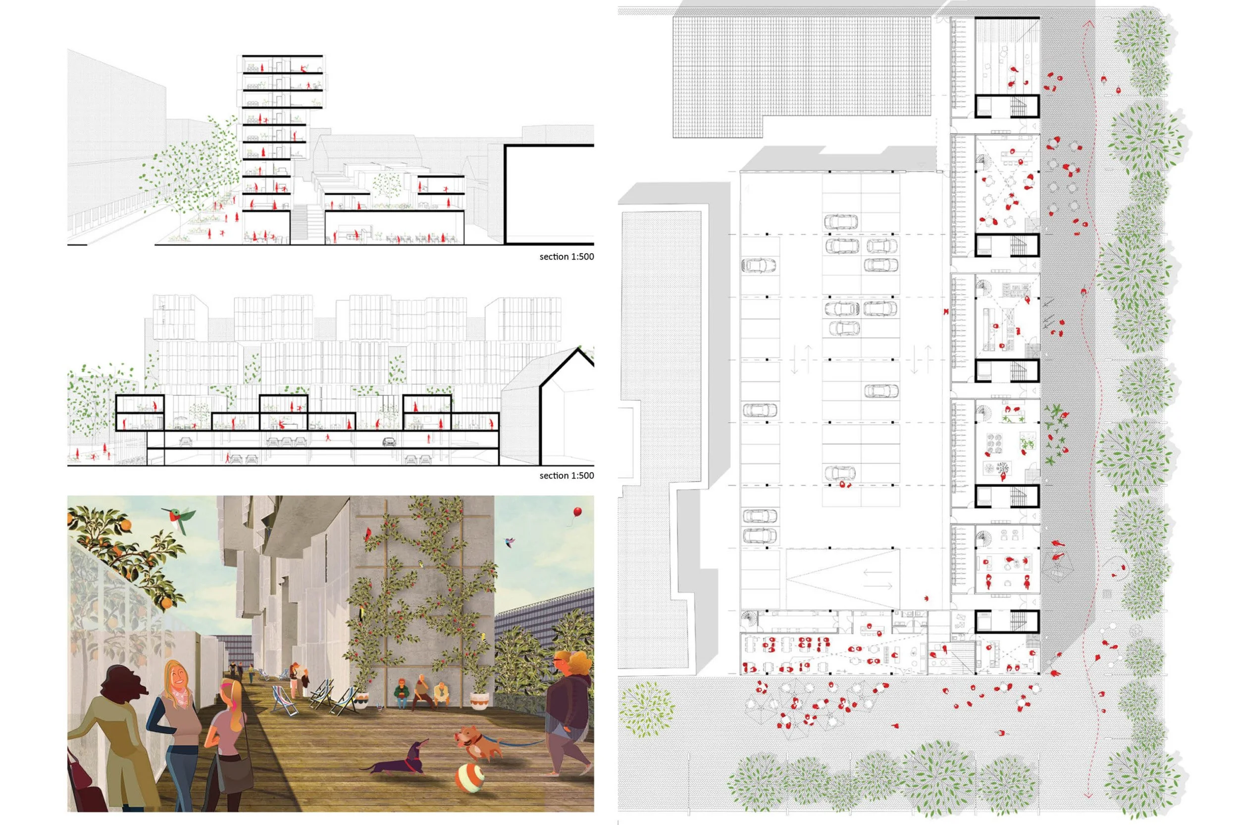 A building where mine meets ours, where private meets public and where community meets comercial. A building where space is understood as a precondion for complex of social relations between different users.Designed with GRAFT Brandlab and herbst.design